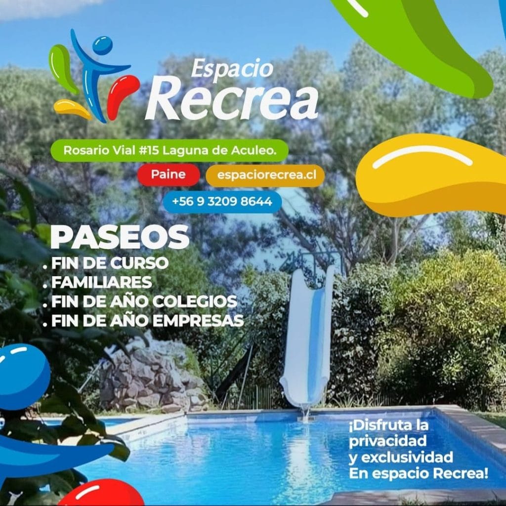 Ven a disfrutar de nuestras instalaciones rodeadas de naturaleza, que incluyen piscinas con tobogán, amplios quincho, canchas de futbolito y más. Estamos ubicados en Acuelo, Comuna de Paine, a solo 60 minutos de Santiago. ¡Vive una nueva experiencia en Espacio Recrea!